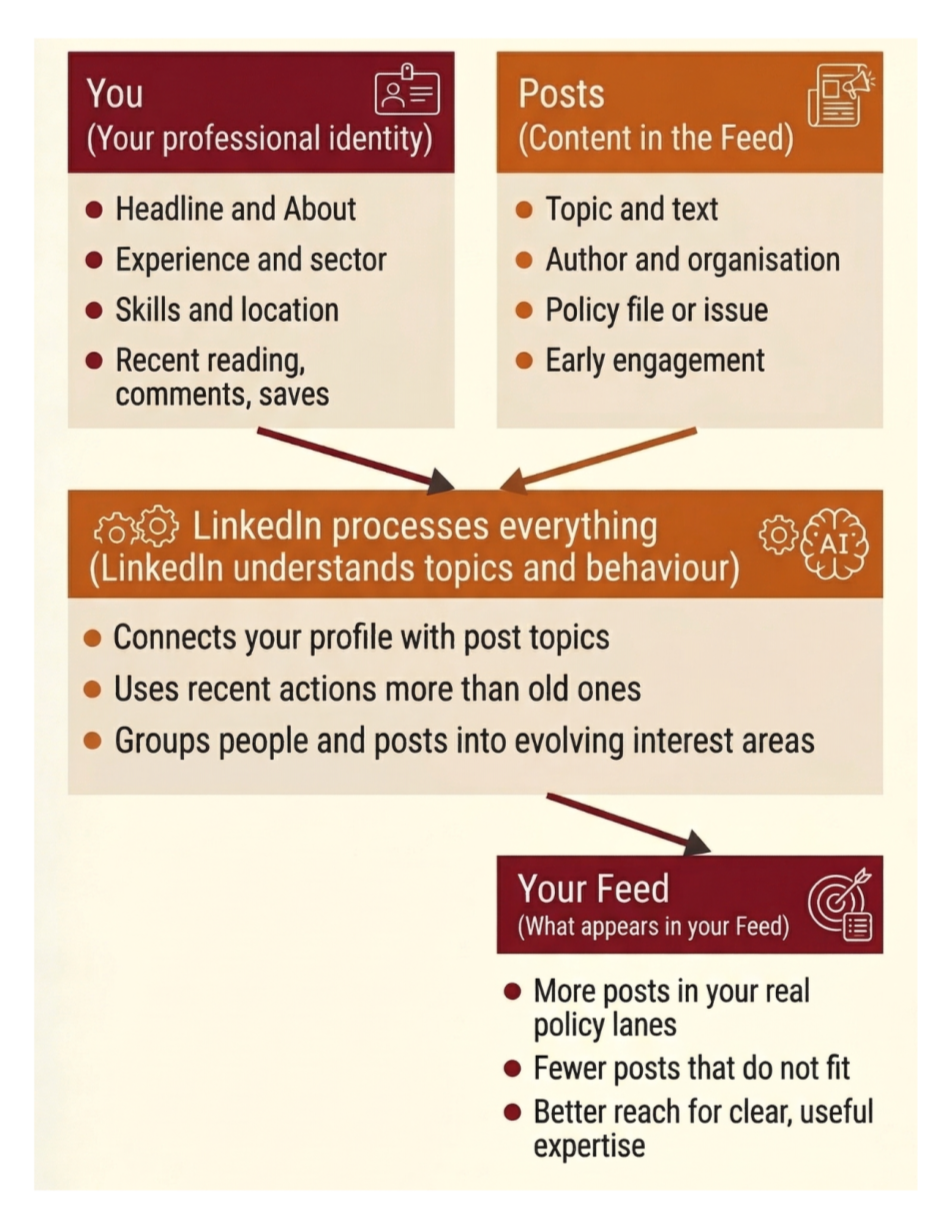 If your experience, skills and featured section are all aligned with a policy area, and your posts consistently reflect that, LinkedIn has a very clear story of who you are.